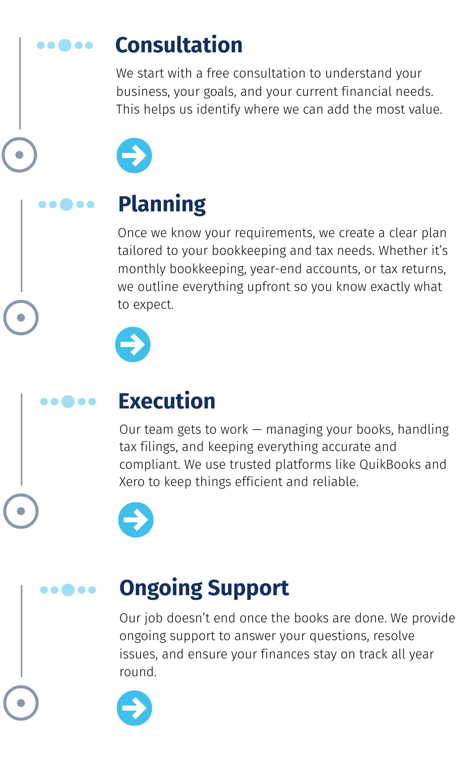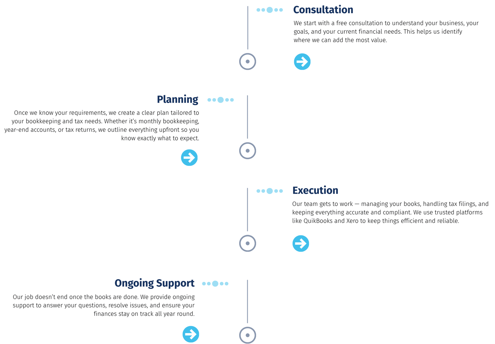 At Quik Accountants and Bookkeepers, we believe that working with an accountant should never feel complicated or stressful. That’s why we’ve designed a simple and transparent process to support you every step of the way.
